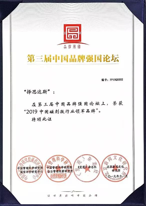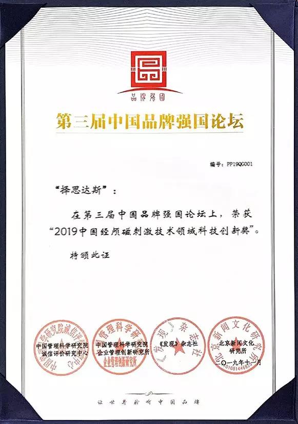 本次品牌盛典,择思达斯一举斩获“2019中国磁刺激行业领军品牌”和“2019中国经颅磁刺激技术领域科技创新奖”两项殊荣,赢得了获得业界人士的高度赞誉和认可,荣誉的背后,彰显着择思达斯在质量口碑、技术创新、售后服务、信用评级、品牌赞誉以及公益社会责任等多方面均走在了行业前列。